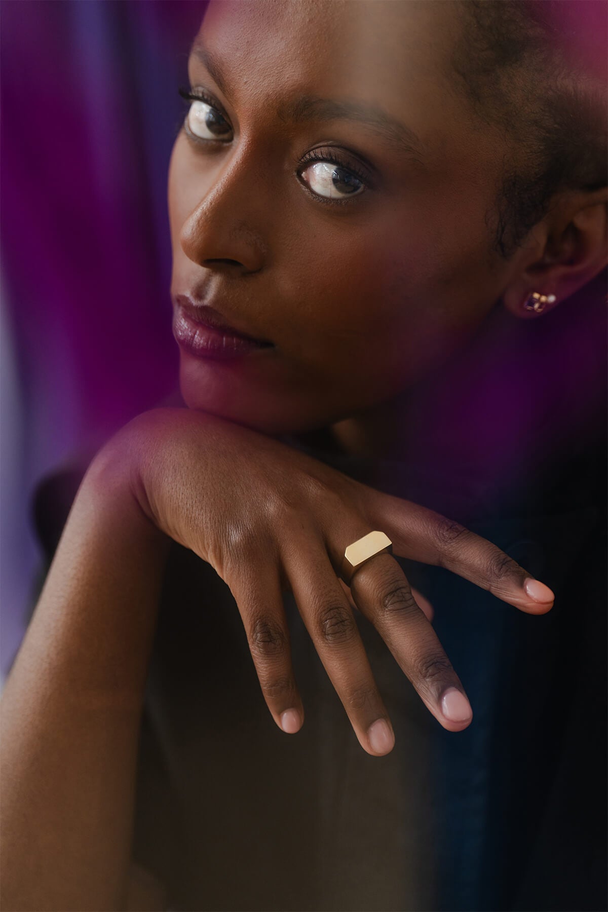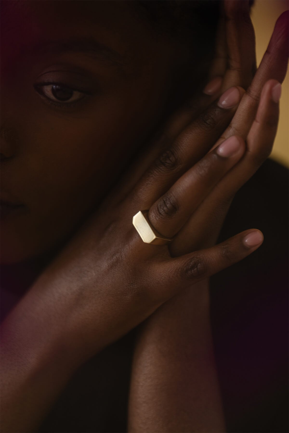 A contemporary take on the classic signet ring. The emerald-shaped top is split in two — one side flat and graphic, the other echoing the contours of a traditional signet. A bold yet understated design that plays with symmetry and contrast in a quietly sculptural way.
