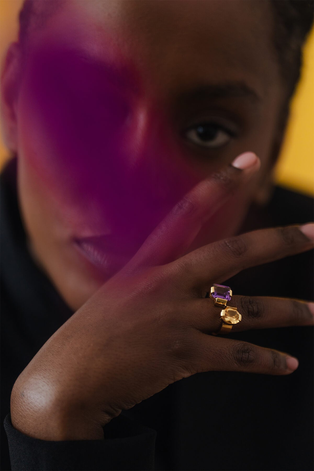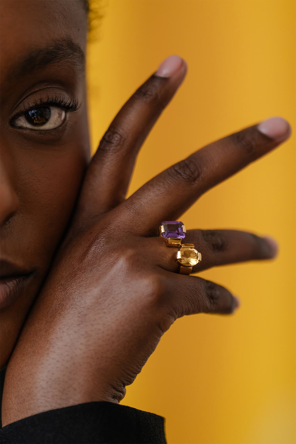 The solid band folds into itself, forming a sculptural base for two diagonally placed gems: emerald-cut amethyst and oval citrine. Facet-edged walls rise gently from the band, holding each stone with quiet precision. A composition where structure meets contrast.